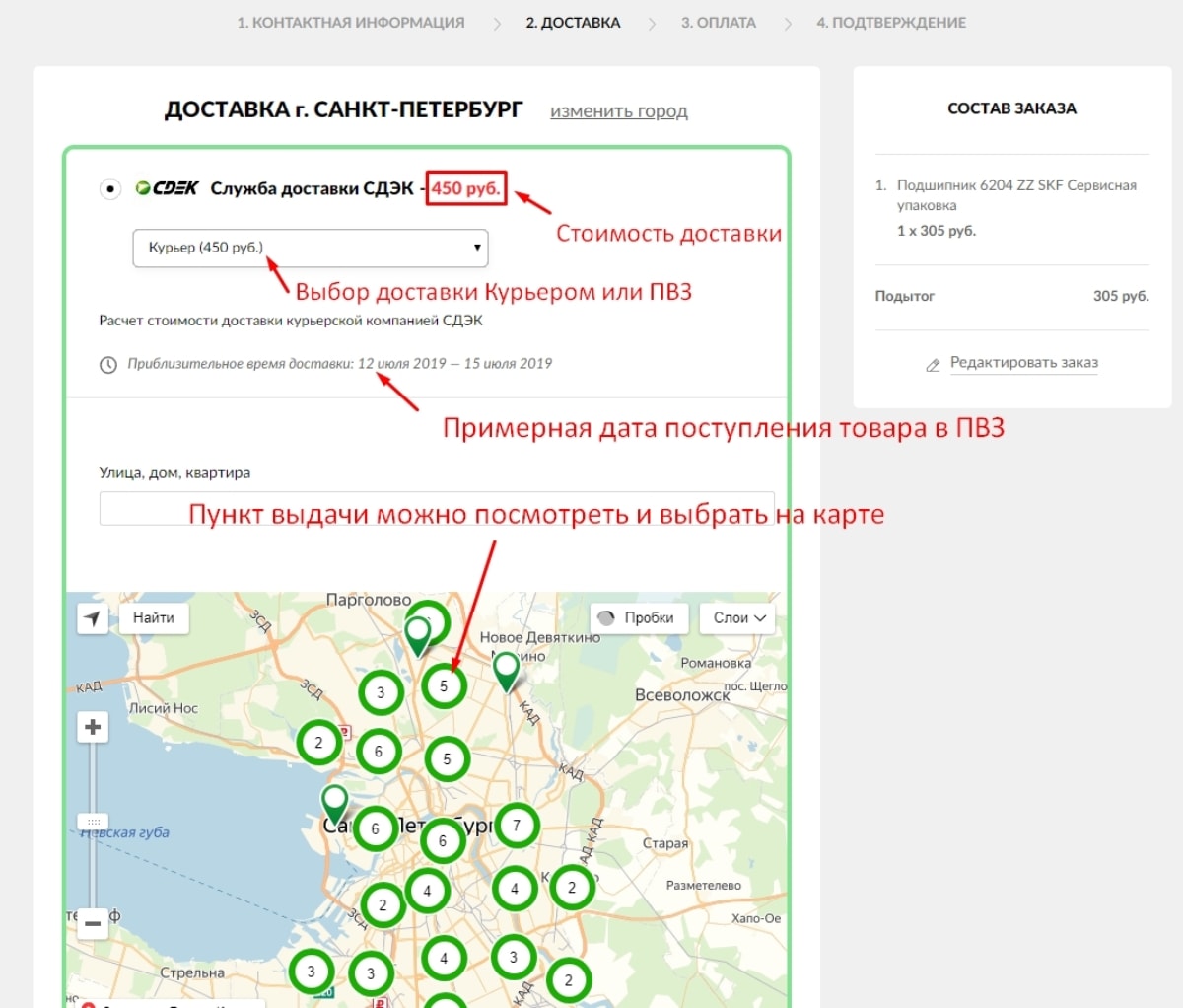 Пример, как посмотреть пункты выдачи в Вашем городе и стоимость доставки на шаге Доставка при оформлении заказа